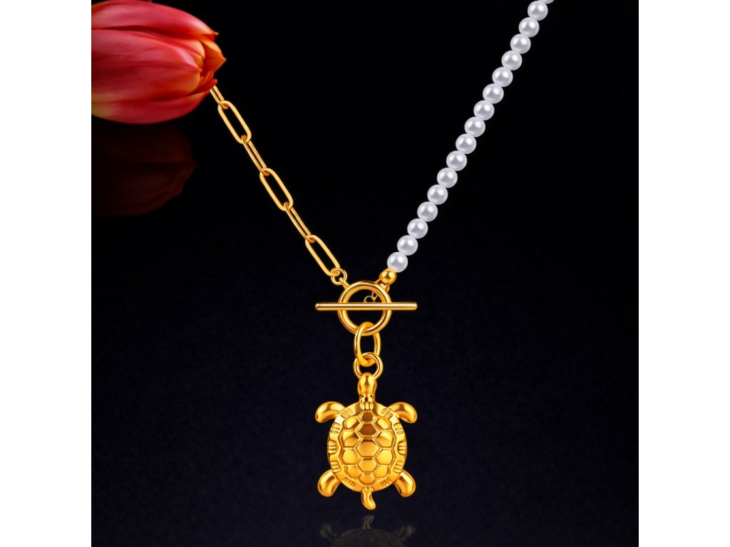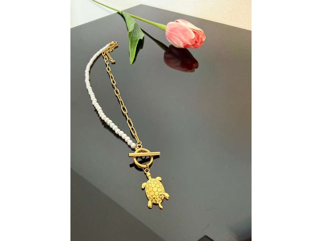 🐷 Pozlacený náhrdelník Želva – ocel & perly (316L, 45 + 5 cm)*