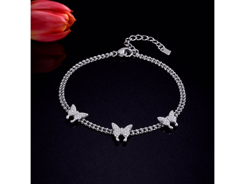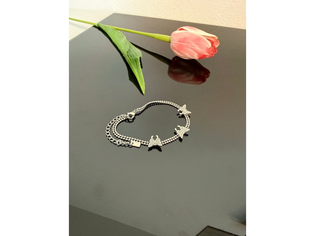 Třpytivá elegance s lehkostí motýlích křídel 🦋✨ Tenhle náramek z chirurgické oceli 316L tvoří dvě spojené řady ocelových kuliček, které zdobí tři zářiví motýlci osázení zirkony. Jemný, romantický a přitom dost originální kousek, který rozzáří tvoje zápěstí každý den.
