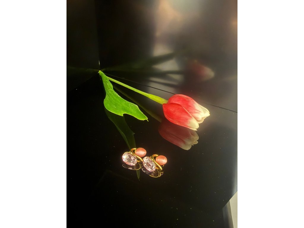 Tyhle náušnice z pozlacené chirurgické oceli 316L s jemně růžovým kamenem jsou přesně ten typ šperku, co zvládne být něžný i výrazný zároveň.