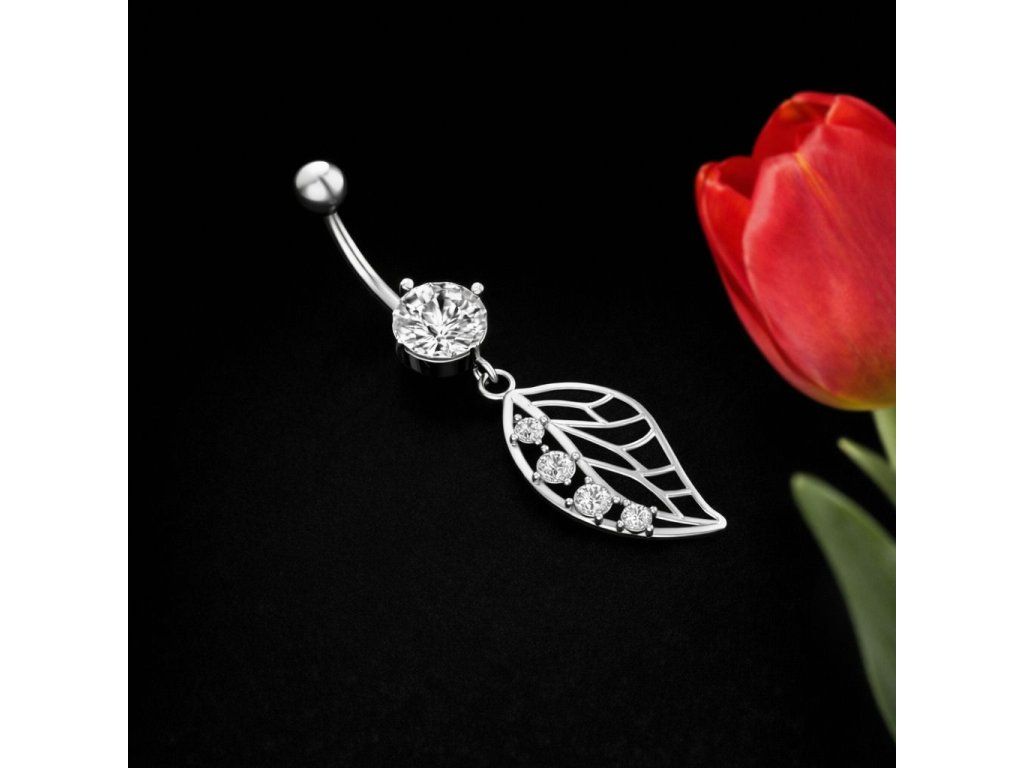 Piercing do pupíku, který přitáhne pozornost na první pohled. Jemný design kombinuje zářivý kamínek a přívěsek ve tvaru listu, který je ozdobený drobnými třpytivými kamínky. Výsledkem je elegantní šperk, který působí lehce, ženským dojmem a zároveň dostatečně výrazně.