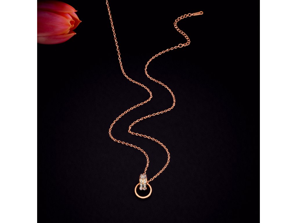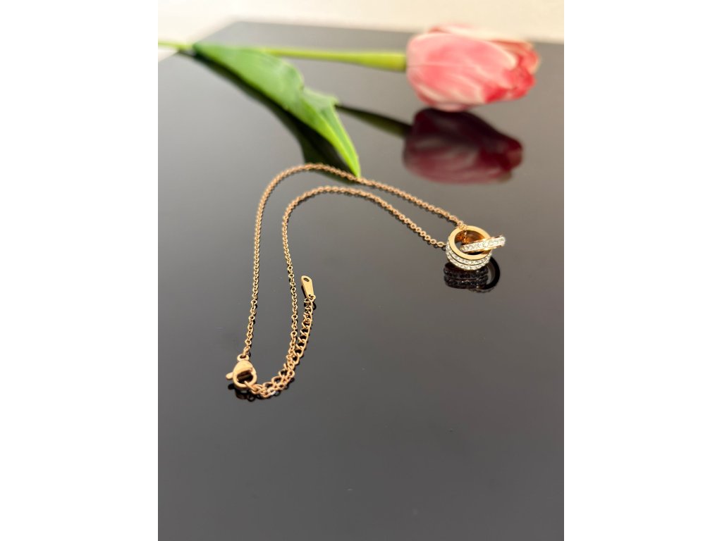 Spojení, co má smysl 💞 Tenhle jemný náhrdelník z růžově pozlacené chirurgické oceli 316L zdobí přívěsek dvou propojených koleček osázených zirkony. Symbolizují vztah, harmonii a propojení – ideální jako dárek z lásky, přátelství nebo jen tak, pro radost sobě.