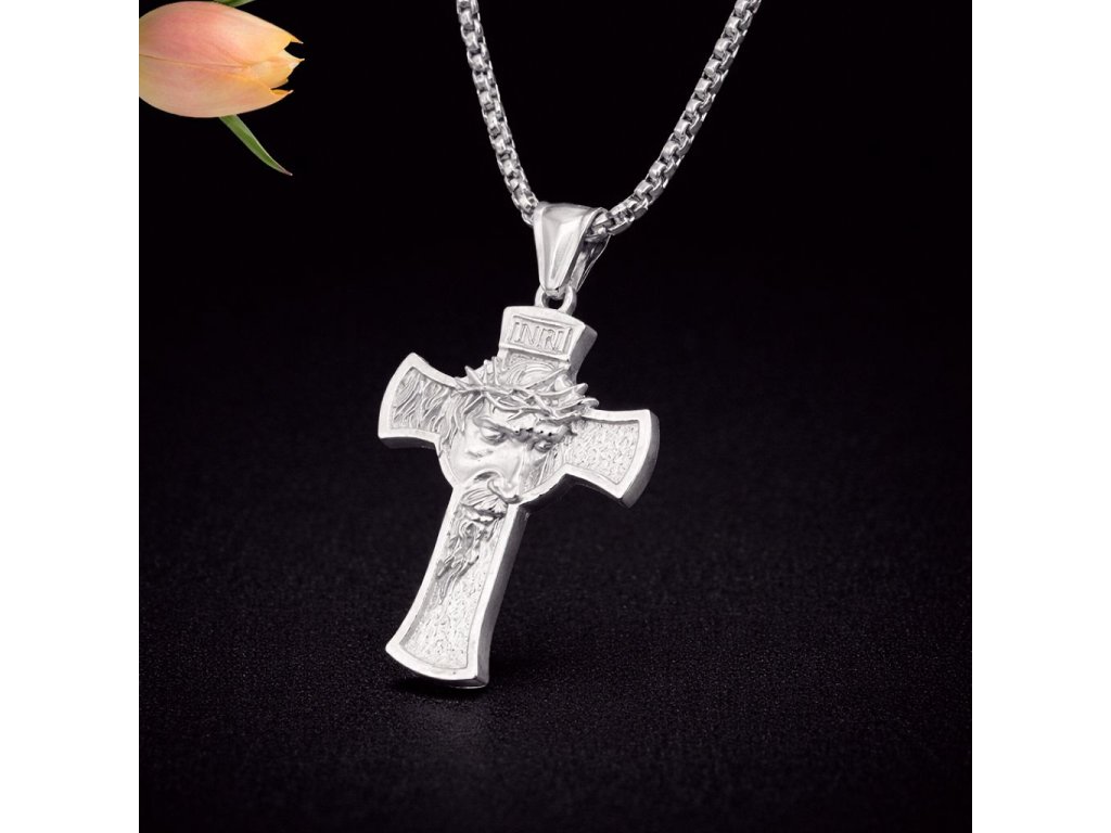 Masivní přívěsek kříže s reliéfem Krista dává jasně najevo sílu i charakter, ať už ho nosíš jako víru, symbol, nebo prostě parádní doplněk.