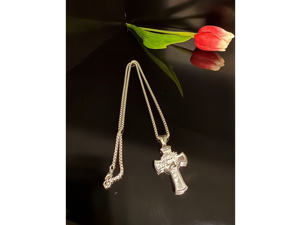 Drsný vzhled, poctivý materiál a nadčasový symbol – to je náš řetízek s křížem z chirurgické oceli 316L.