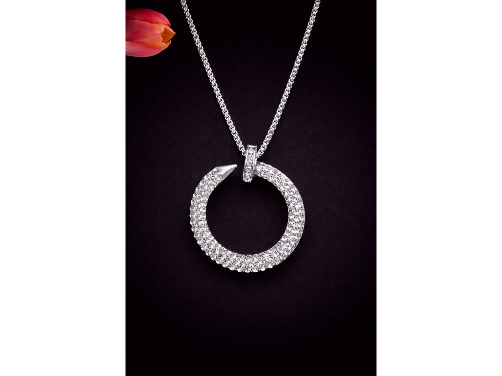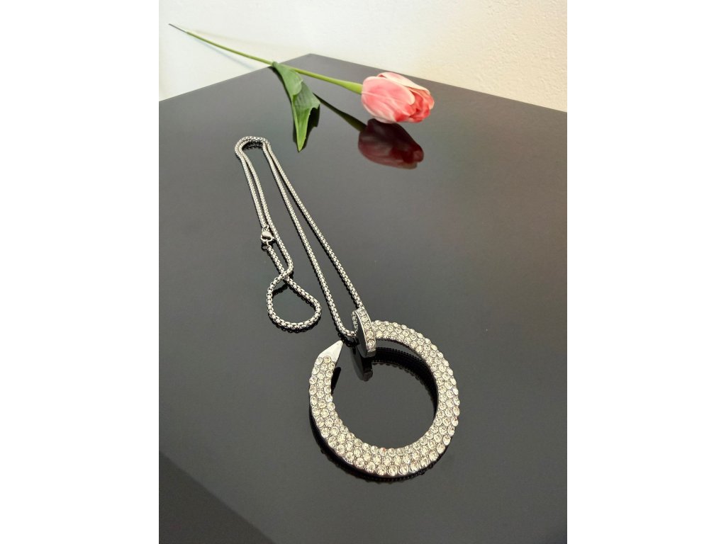 Tenhle řetízek z titanové oceli (70 cm) nese přívěsek třičtvrtě kolečka o průměru 5 cm. A aby to nebyla nuda, celý je osázenej kamínkama, co se blyští jak světla na pouti.